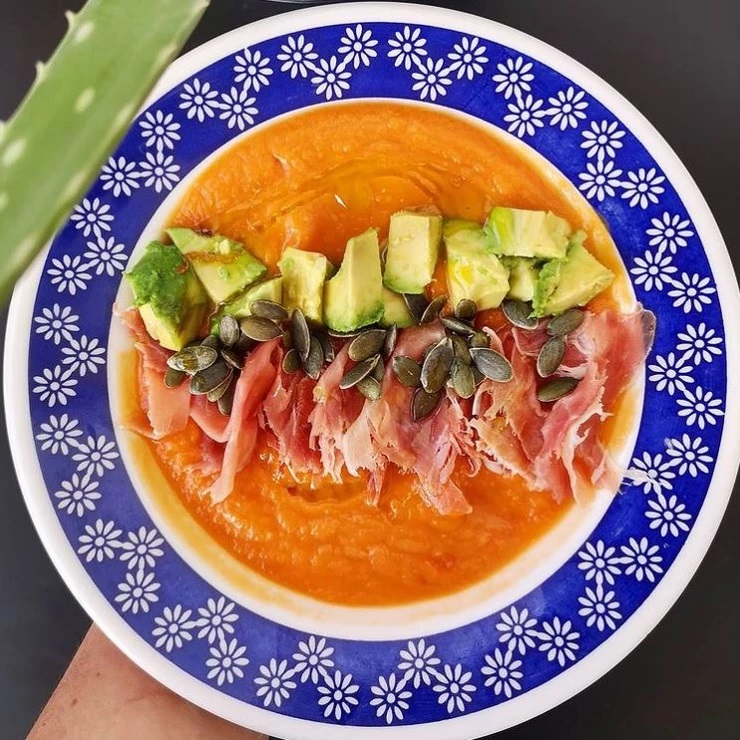 El salmorejo se sirve tradicionalmente en una plato hondo y se decora con trocitos de jamón, huevo cocido, atún o como a mí que me gusta agregarle también aguacate (es que el aguacate pega con todo ).